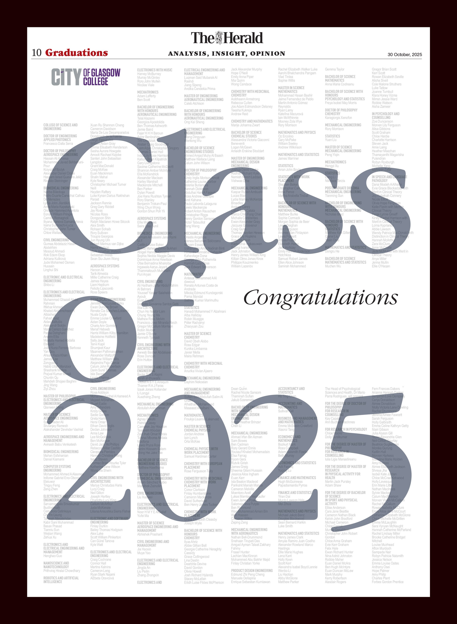 Celebrate your special graduation day with a personalised print featuring The Herald’s iconic graduation listings.